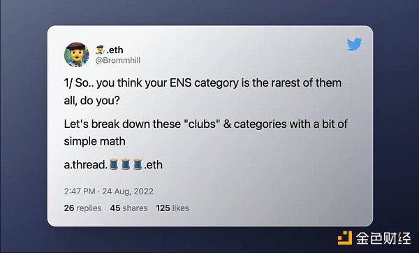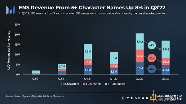 在 22 年第二季度,人们争先恐后地铸造 3 和 4 个字符名称和短词。随着这些类型的 ENS 名称数量的减少,创造昂贵名称的机会也减少了。由于可以注册这些昂贵的名称,相对于 5 个以上的字符名称,3 和 4 个字符名称的注册收入份额在 22 年第三季度显著下降。