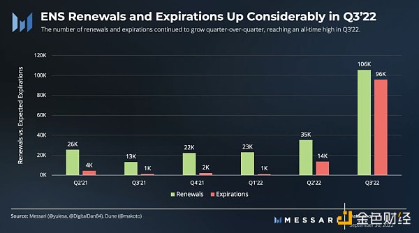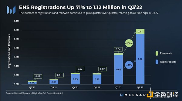 ENS 域名注册量在 22 年第三季度达到 112 万的历史新高,环比增长 71%。同时,在 22 年第三季度,续订量环比增长 3 倍,超过 100,000 次;