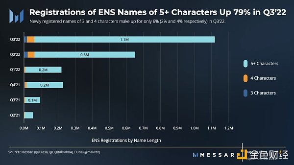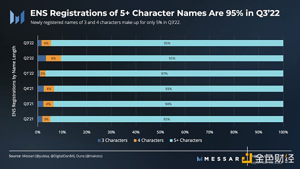 就 ENS 名称长度而言,在 22 年第三季度的所有 112 万个注册中,超过 5 个字符的名称占 106 万个(96%)。值得注意的是,从 22 年第二季度的 60 万到 22 年第三季度的 110 万,绝对值环比增长 79%,超过 5 个字符名称的注册增长速度快于整体 ENS 注册(环比增长 71%)。存在两种可能的解释:较长的名称更便宜,流行的 3 和 4 字符名称已大量注册。这种成本和稀缺性的结合导致注册了更多 5 个以上的字符名称。