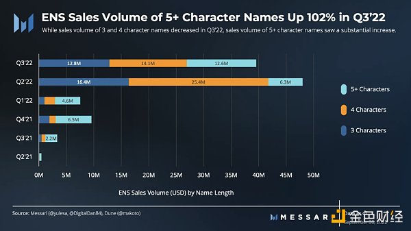 按字符长度划分的 ENS 二次销售量显示了过去两个季度短字符名称的爆炸性增长。尽管 3 字符和 4 字符名称的交易量从 22 年第二季度到 22 年第三季度有所下降,但与 22 年第一季度相比,当前交易量仍增长了 10 倍以上。尽管整体市场疲软且流动性较低,但 ENS 是少数几个销量强劲的资产之一,尤其是在涉及稀缺数字资产时。销量的增长意味着 ENS 域名的感知价值在数字资产用户中排名很高。