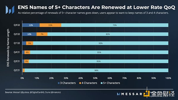 在过去六个季度中,3 字符和 4 字符名称的续订量有所增加,占 22 年第三季度所有续订量的 27%。相比之下,在过去六个季度中,超过 5 个字符的域名的续订量一直在下降。一种可能的解释是,ENS 名称持有者可能希望长期保留 3 和 4 个字符的名称,因为它们比 5 个以上字符的名称更罕见。这意味着 3 和 4 个字符的域名可能代表了良好的长期价值存储。