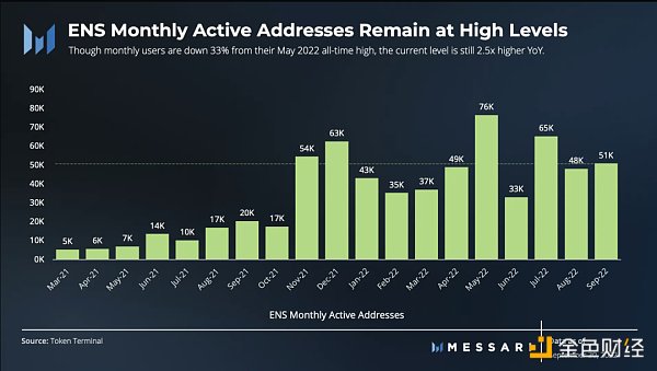 数据显示,即使更广泛的 Web3 市场在过去几个季度遭受大量用户缩减,ENS 月度活跃地址仍然保持强劲。尽管比 2022 年 5 月的历史高点减少了 33%,但当前的活跃地址水平仍比 2021 年初高出 10 倍,比一年前高出 2.5 倍。