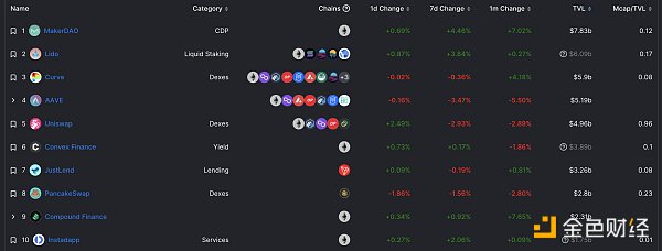 DeFi项目锁定资产前十排名及锁仓量 数据来源:defillama