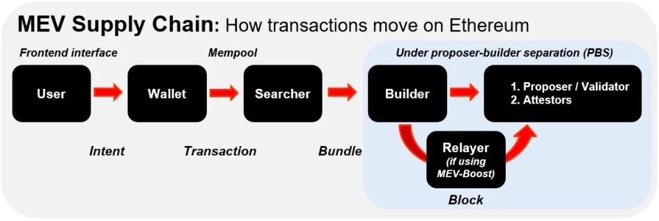 在 PBS 下,区块构建者相互竞争,以创建来自搜索者的聚合有序交易列表。这些交易包进行了优化,以最大限度地提高建设者自己的 MEV 费用,然后将其传递给区块提议者。提议者根据自己的最高费用选择交易来创建区块并将其发送到网络主链上。