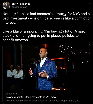 有趣的是此前Eric Adams表示,其纽约市长的薪水将接受比特币作为工资。激进的策略也引来一些人的批评。纽约市的前首席经济顾问Jason Furman称之为纽约市糟糕的经济战略。