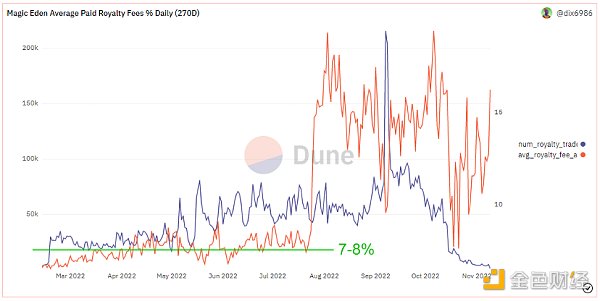 2022 年 8 月开始,单笔 NFT 交易支付的版税的日均百分比开始呈指数级增长,有些时候单笔交易的版税甚至高达 19.34%。这最终导致交易者寻求其他的 NFT 市场以避免支付如此高的费用,同时也在无意中引发了两极分化的辩论。