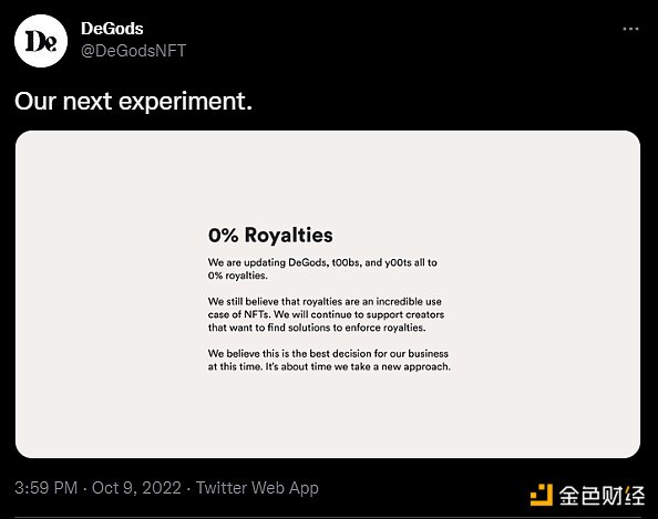 尽管如上所述,零/选择性的创作者版税确实带来了一些好处,但我们认为它造成的问题要比其他方面多得多。也就是说,我们确实同意,在这个领域需要有更大的创新,以确保独立艺术家和创作者得到应有的照顾。虽然 DeGodsNFT 最初并不支持零版税运动,但他们认识到这个问题需要用不同的方法来解决。
