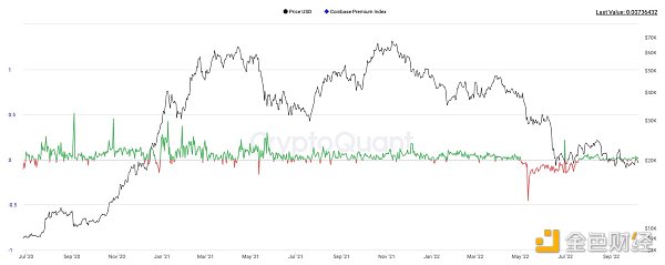 coinbase溢价指数着眼于 coinbase pro 价格(对于 BTC,以美元为单位)和 binance 上的价格(对于 BTC,以美元计)之间的差异,这是衡量美国投资者购买 BTC 的兴趣的指标。最近有点平,但值得注意的是 2022 年 5 月的折扣。
