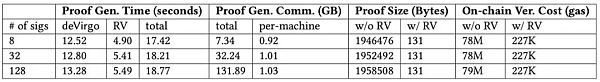 然后,中继网络将Groth16证明提交给可以在链上验证它的更新合约。deVirgo证明系统具有后量子抗性,因为它只依赖于抗碰撞哈希函数,主要的计算瓶颈是大型电路中的数论变换(NTT)。有一件事似乎没有被提及,即中继网络的计算将遭受与MPC相同的通信复杂性,这也将影响证明时间。对于中继网络中的N台机器,GKR多层和校验协议的通信复杂度为O(N log_2(gates per layer))。即使对于32个签名的情况,在中继网络中有32台机器,这也将导致网络中的通信轮数比较多,这可能会完全扼杀分布式计算带来的性能。