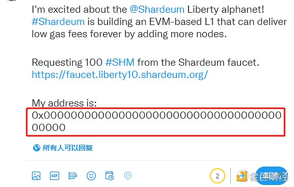 2.前往https://faucet.liberty10.shardeum.org/领水,打开页面,点击Tweet Now,弹点击Okay,跳转到推特,将最方框的地址替换为你自己的地址,然后发推文,点击推文,将粘贴领水贴的链接输入,复制到该链接测试推文