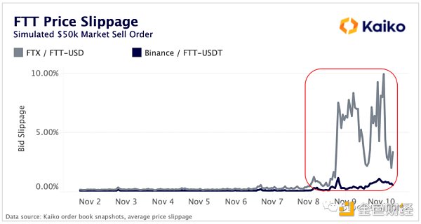 通过观察价格下滑,我们可以看到 FTT 流动性崩溃的速度有多快。通过模拟 5 万美元的市场卖出指令,在币安和 FTX 上市的两种流动性最强的 FTT 对的跌幅急剧上升。到周三,在 FTX 一个 5 万美元的 FTT 卖出订单将导致 FTT 价格大幅下跌 8%(在这里提醒投资者,市值不代表流动性充足,流动不充足的情况下,市值 100 亿,也是海市蜃楼)。