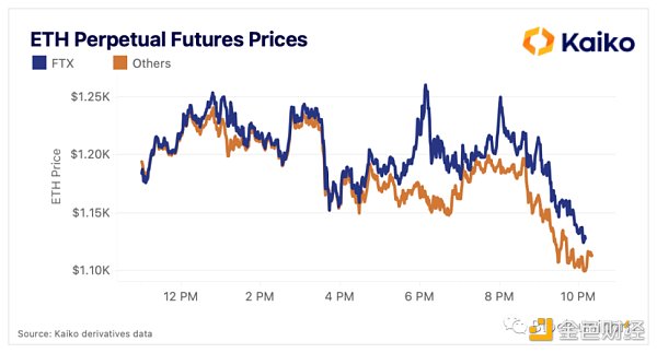 FTX 现在是在炼狱,交易所的所有资金实际上都变成了大富翁的钱或合法债权,这取决于你的时间跨度。做市商和投资用户都被困在交易所里,与其他市场隔绝,只能发展自己的生物圈,这一点最简单的体现是 FTX 上的 ETH 永续合约的价格,它在 11 月 9 日开始出现与其他交易所的 ETH 价格出现偏离。