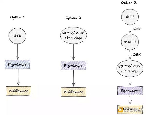 除直接 Restake $ETH 之外,EigenLayer 提供了其他两种选项以扩展 Total Addressable Market,即分别支持质押 WETH/USDC 的 LP Token 和 stETH/USDC 的 LP Token。