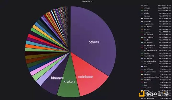 据估计,Coinbase 控制着 13.2% 的质押,甚至更多。如果你想知道为什么 Lido 验证者在这个图表中没有统一,那是因为 Lido 由一个验证者联盟组成,这个图例将他们单独分开了。Lido 不能强制要求特定的验证者如何运行他们的节点,但在上海升级中启用提款功能后,Lido DAO(LDO Token 持有者)可以删除那些未能按照 DAO 意愿执行的验证者。如果汇总起来的话,Lido 的总份额将达到 31.1%。