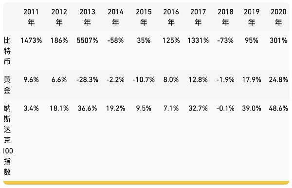 自2009年问世以来,比特币的价格一直大幅波动。上述因素均对整个变化过程产生了重要影响。虽然起伏不定,但与初期相比,比特币的价格确实大幅上涨。如果将比特币与纳斯达克100指数和黄金进行比较,便会发现它远超这两种一直表现强劲的资产。您还可以看到它的波动性——比特币的年度亏损比率也比黄金或纳斯达克100指数更高