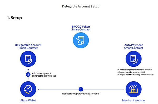 首先,商户需要部署自动支付智能合约。当拥有可委托账户的用户访问商家网站时,他们将看到批准自动支付的请求——类似于Visa接受的账单。此时,用户可以看到自动支付合约将以用户的名义执行操作,其中能够按照用户需要设定参数,比如每月只能向用户收费一次、收费不能超过设定的最大金额等。最重要的是,由于这是一个智能合约,用户可以确信自动支付合约不会以其他方式被执行。
