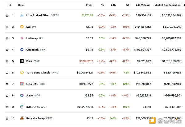 DeFi项目锁定资产前十排名及锁仓量 数据来源:defillama