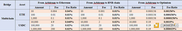 当 USDC从 Arbitrum跨链到 BNB Chain 时,仅Multichain 和 cBridge 支持USDC 跨链,Multichain 在 100 U 和 1000 U 时费用较低,竞争力较强,cBridge 在 1 万 U、10 万 U 和 100 万U 的情况下费用较低,竞争力较强。