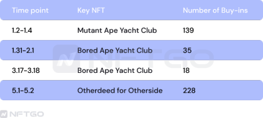 图为 2022.1-2022.12 的巨鲸资金的买入走势图,今年 1 月份到 4 月份巨鲸资金以「间歇性爆发」为特点,多次出现买入巨量交易额,这种行为特征主要根据当时市场的炒作性事件而显现,如图标注时间段均为交易的峰值区间,下图为各交易峰值点巨鲸买入排名第一的 NFT 及数量。