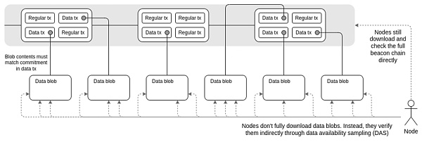 那怎么改进呢?我们可以把L2传过来的数据单独设计一个数据类型,把它和L1的Calldata分开。这种数据类型只需要满足能在一定时间内被有需要的其他人所访问下载即可,无需做全网的同步。实际上,这点也被众多以太坊技术社区的成员所想到了。