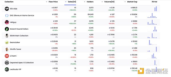 24小时NFT交易量、交易量前十项目 数据来源:Coinmarketcap
