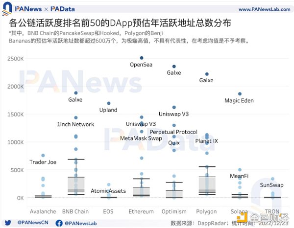 为了剔除活跃DApp总数对观察各公链DApp活跃地址数的影响,PAData还计算了各公链单个DApp预估年活跃地址的均值。在去掉极端高值后,单个DApp预估年活跃地址的中位数最高的是Solana,约为1782个,其次是Optimism,约为1387个。其他公链单个DApp预估年活跃地址的中位数基本都在100-300个左右。