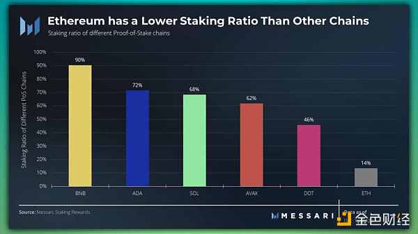 我研究中的另一个新叙事是流动性质押衍生品(LSD),LSD token 允许投资者在使用其他 DeFi 基础 token 时获得质押收益,在大多数 L 1 中,ETH 的质押率最低,仅为 14% 。