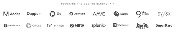 Alchemy (成立于2017年8月,总部位于美国加利福尼亚州)是区块链领域的开发者平台。Alchemy负责构建区块链的基础设施部分,开发人员可以将时间集中在创造出色的产品上。Alchemy 构建了自定义技术和工具,创建一个强大的平台,开发人员使用该平台来使他们的区块链项目工作。Web3 中的顶级公司都建立在 Alchemy 之上,诸如 OpenSea、Dapper Labs、Adobe、Axie Infinity 等公司。几乎每个 NFT 市场、大多数 DeFi 组织以及 70% 的领先 Web3 dapp (去中心化软件)都建立在 Alchemy平台之上。