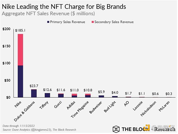 在大品牌 NFT 竞赛中,耐克遥遥领先。迄今为止,该公司已售出超过 1.85 亿美元 NFT。其还在 Roblox 中推出「Nikeland」,粉丝可以在这里创建头像并进行运动。仅第一年,该系列 NFT 就吸引超过 2100 万用户。