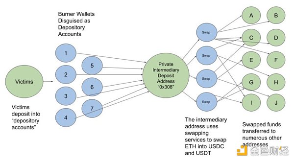 随后资金会再被转移到去中心化交易所被交易为稳定币,然后再分散到其他的各种地址中。欺诈者会通过将受害者资金通过这种方式转换为法币而后脱手。