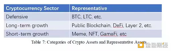 接下来我们可以借鉴股票类型的划分方法将加密货币分为防御型币种和周期型币种,其中周期型币种又可分为长期成长型币种和短期题材型币种,如下表: