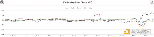 在整个 11 月,BTC 的融资率在 The Block 追踪的所有主要交易所中基本为负值。一般来说,正资金费率意味着正面的价格行为,负资金费率意味着负面的价格行为。