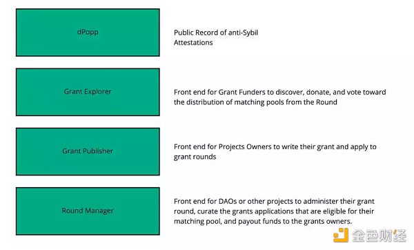 「dPop」提供的是防女巫攻击证明的公开记录,「Grant 搜索器」提供的是为资方寻找项目进行捐赠而搭建的前端,「Grant 发表器」提供的是受赠方提交项目描述并申请捐赠的前端,「募资轮负责方」提供的是 DAO 或其他项目管理募资轮、筛选受赠项目申请和调动资金池配资的前端。与 Grants 1.0 统一、中心化的聚合器模式不同的是,Grants 2.0 设想的是端到端、去中心化的定制体验。募资轮负责方可以基于底层框架进行自由地开发和组合使用,探索项目募资的最佳范式。