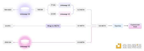 Permit 2 和 Universal Router 结合后,用户可以在 Uniswap V2和V3上单笔交易执行多个代币交易的行为,并在一次交易中从多个市场购买 NFT。比如使用交易路由在 Uniswap V2和V3上执行 ETH 交易为 WETH,并在 OpenSea 上购买某个 NFT,整个流程可以作为一次交易执行完毕。