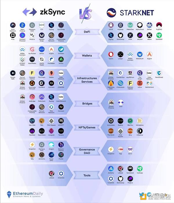 在目前的整体Layer 2格局下,技术路线的主要在于SNARK和STARK之争,其代表性项目前者有zkSync,后者有StarkWare,两者的主要区别在于如下: