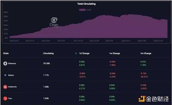 USDC 在以太坊、Solana、Avalanche、Tron 等 59 条公链流通,在以太坊上的份额达到 83.7%