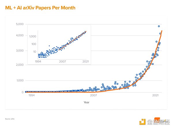 上图是每月 arXiv 中发表的关于机器学习或人工智能的学术论文数量。正如图中所示,论文的数量正在呈指数级增长,且没有放缓的迹象,而这部分数据仅仅包括已经发表的论文,还有许多研究并没有公开发表,而是直接应用于开源模型或产品研发,这些开源模型和产品,带来了爆炸式的创新。