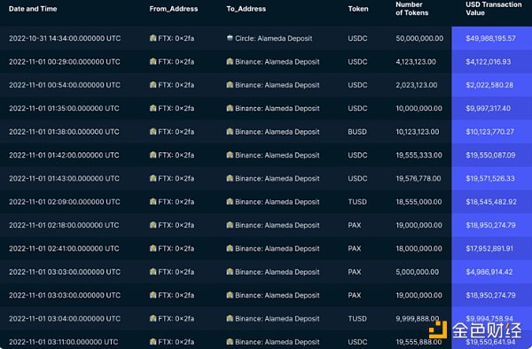 22年10月31日 – 11月1日:FTX和FTX US向Circle和币安发送价值3.88亿美元的稳定币。