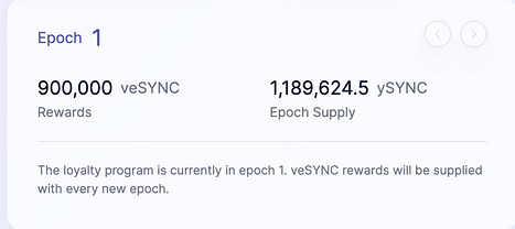 用户每产生$ 1 交易手续费可以获得 1 ySYNC,genesis epoch 中用户共计 mint 1.18 M ySYNC(即共产生 1.18 m 美元手续费),按照 ySYNC 持有量平均分配 900, 000 枚 SYNC,最终每 1 个 ySYNC 可以获得约 0.76 枚 SYNC。目前该活动在 genesis epoch 后处于暂停状态。