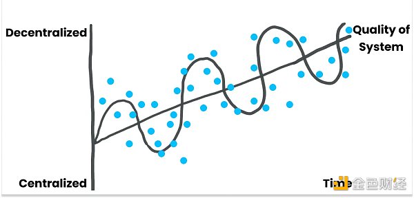 (是的,我知道,这张图表不太正确,因为看起来事情变得越来越去中心化,但我只是想表明随着我们从中心化到去中心化来回翻转,它们正在变得更好)