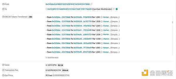 通过链上行为可以看到,代币创建者使用了 CoinTool 这个工具的 Multisender 的功能,熟悉链上数据的朋友可能会对 CoinTool 这个工具比较熟悉,曾经很长一段时间在 ETH Gas 消耗榜单上霸榜,代币创建者使用 CoinTool 对大量地址进行 Simpson 代币分发,通过浏览器工具我们可以看到,代币创建者共计使用了 CoinTool 4次,共计发给了 800 个地址,每个地址发了 1000 枚 Simpson 代币。