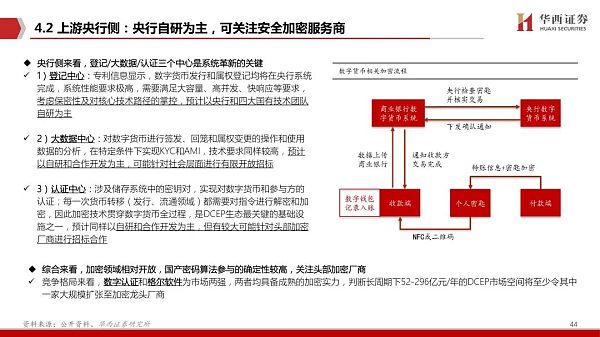 结合替代纸币的逻辑,进一步把数字货币的产业链进行了区分:上游央行侧,中游商业银行侧,下游公众应用侧。并根据数字货币在不同产业链环节所需的IT投资进行了测算。我们认为产业链的市场空间排序为为:中游银行侧>下游公众侧>上游央行侧。