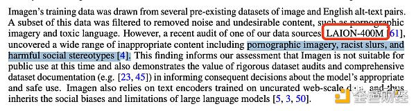 早在Imagen发布时,也专门针对LAION-400M做出警示:因为依赖于这种未经整理的网络数据, 集成了大模型的社会偏见和限制,因此不适合公开使用。