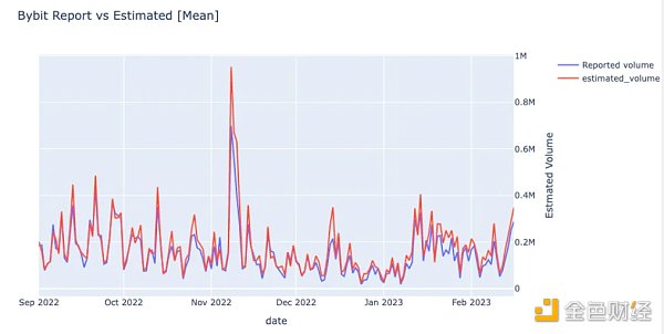 使用相同的方法来估计 Binance 和 Bybit 的真实交易量比,结果与报告的交易量非常接近。