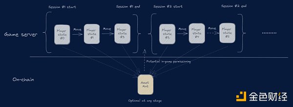 这种模式下,用户资产存储在链上,而游戏循环在链下进行。游戏服务器在会话开始时对链上资产状态进行索引,状态转换在链下的游戏服务器上进行记录。只有在游戏会话结束或游戏循环结果对资产状态产生实质性影响时,游戏服务器才会将状态回传至链上。例如,用户可以选择“保存状态”并支付相关的 gas 费用。这种方法在速度和性能方面取得了优势,但在可信度方面进行了妥协。