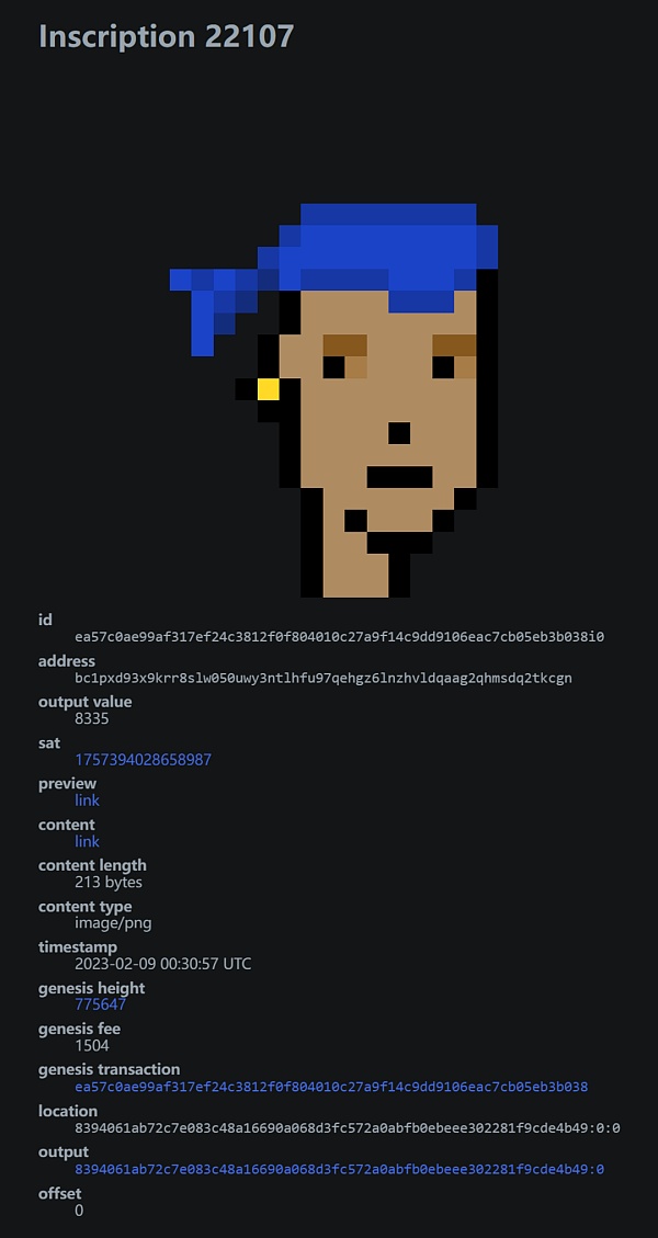 以 BTC 上的 CryptoPunk 为例,每个 NFT 的聪、区块、铭文等信息可以通过 ordinals 查看,如下图所示: