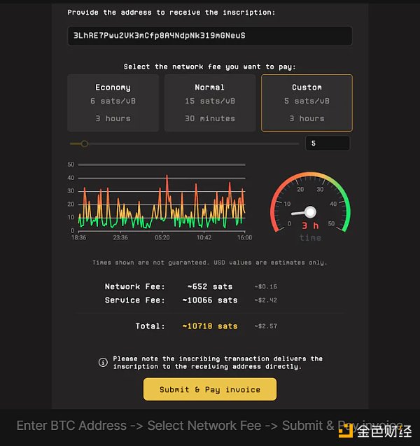 步骤3:输入你的比特币地址以接收BRC-20并选择网络费用