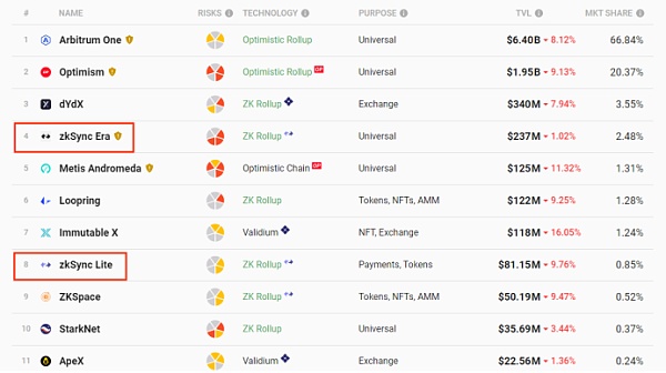 曾经的 layer2 四大天王:Optimism、Arbitrum、zkSync、StarkNet,已仅剩后两者没有分配治理token。Optimism 和 Arbitrum 先后实践了生态积累 + 用Token抢用户的打法,结果已经在 Layer2 生态的市场份额中得到体现。zkSync是目前以太坊zk rollup layer2解决方案中的龙头协议,zkSync有两个网络版本,1.0为lite,2023年3月24日开启了2.0网络era。zk 扩容方案被认为是以太坊可扩展性的终极解决方案,同时也是最被v神看好的,zk rollup在安全性和性能方面取得比较好的权衡,并使用零知识证明,可以做到实时交换。但由于以太坊虚拟机(EVM)不支持 ZK 线路,实现一直是有较大难度。因此Optimistic Rollups类型的解决方案率先发Token,赚足了市场热度,比如目前火热的Arbitrum、Optimism,而zk系列还没有发行Token。