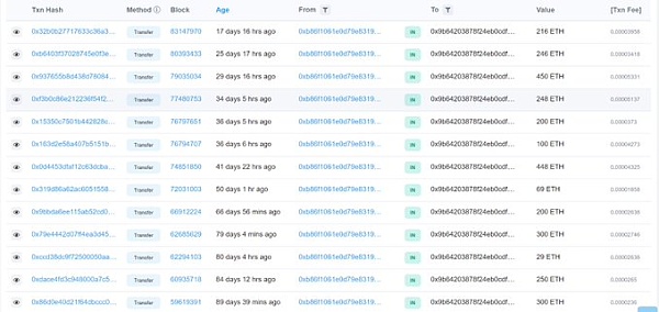 我们刚刚说了 0x9….77e5 将资产转移到其它地址,但在此之前,0x9….77e5 就已经陆陆续续地从 0xb….3300 这个地址收到了 3000 $ETH。