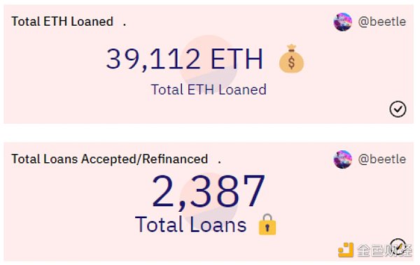 截至目前,Blend 已在总计 2, 387 笔交易中促成了 39, 112 ETH 的贷款。每笔贷款平均贷出 16.39 ETH。